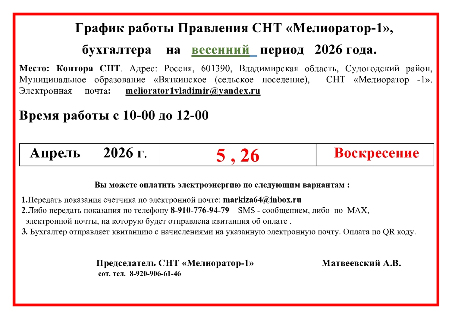 Председатель Товарищества: Матвеевский Александр Владимирович
